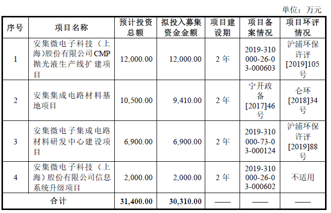 公司此次募资总额为30,310万元,其中对于科技创新领域,包括CMP抛光液生产线扩建项目、安集集成电路材料基地项目、集成电路材料研发中心建设项目,投资比重较大,占总募资金额的93.4%。