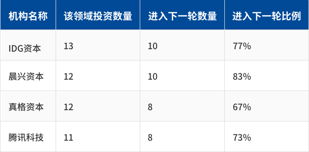 Highlight: 该领域机构进入下一轮比率皆高于60%,多数投资项目进入下一轮。