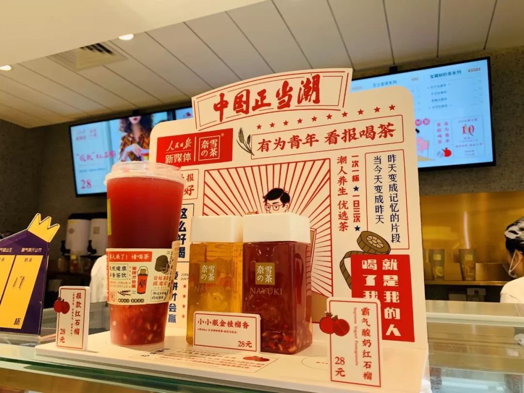 此次推出的快闪店主题为“有为青年 看报喝茶”,现场布置了小卖部、拍照打卡房间、互动小游戏等体验环节。与此同时,奈雪也正式面向全国240余家门店,推出联名款新品“报款红石榴”。此外,像霸气酸奶红石榴,以及玫瑰乌龙茶/茉莉毛尖不同茶底的小瓶金桂榴香,也加入报款红石榴系列。