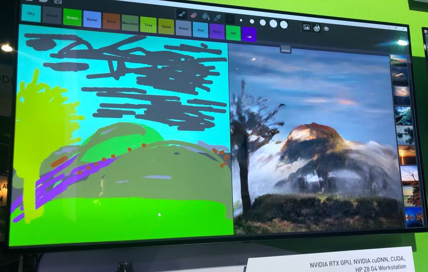 说到NVIDIA,不能不提它发布的 AI绘画的网页应用 GauGAN 。这款取名于画家高更的应用,在大会评选中获得了本次Siggraph的最佳实时现场演示奖(Real-Time Live! Best in Show)以及观众选择奖(Audience Choice awards)。无论是职业电脑画师还是业余的绘画爱好者,都可以利用现场的演示品在几分钟内创作出高水平的绘画图像。