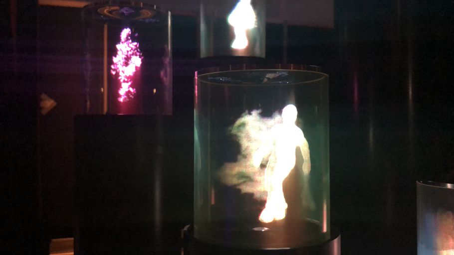 出自索尼日本设计研究中心的这款 360度透明的全息屏幕 给参会者提供了一种很独特的“存在性”现实。实际上,在透明圆柱的背后是 2D影像和高速摄像头传感技术 的结合。