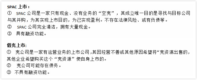 与借壳上市相比,SPAC是造壳上市。专门用于并购上市的SPAC现金壳公司,没有通常反向并购交易中的债务问题,没有历史、成本和清洗以前壳公司的问题。