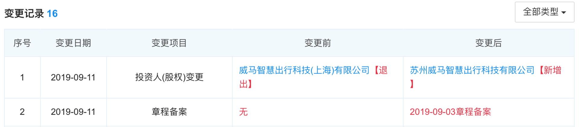 天眼查数据显示,9月11日,威马汽车科技集团有限公司发生大股东变更,原大股东威马智慧出行科技(上海)有限公司从股东中退出,新增股东为苏州威马智慧出行科技有限公司。