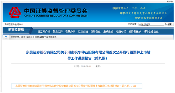 近日,河南枫华种业股份有限公司向河南证监局提交第九期上市辅导报告,第二次冲刺IPO。早在2014年8月,枫华种业就开始踏上IPO之路,但是一年后终止上市计划,并于2016年登陆新三板。2017年9月,东吴证券与其正式签订辅导协议,再次谋划IPO。