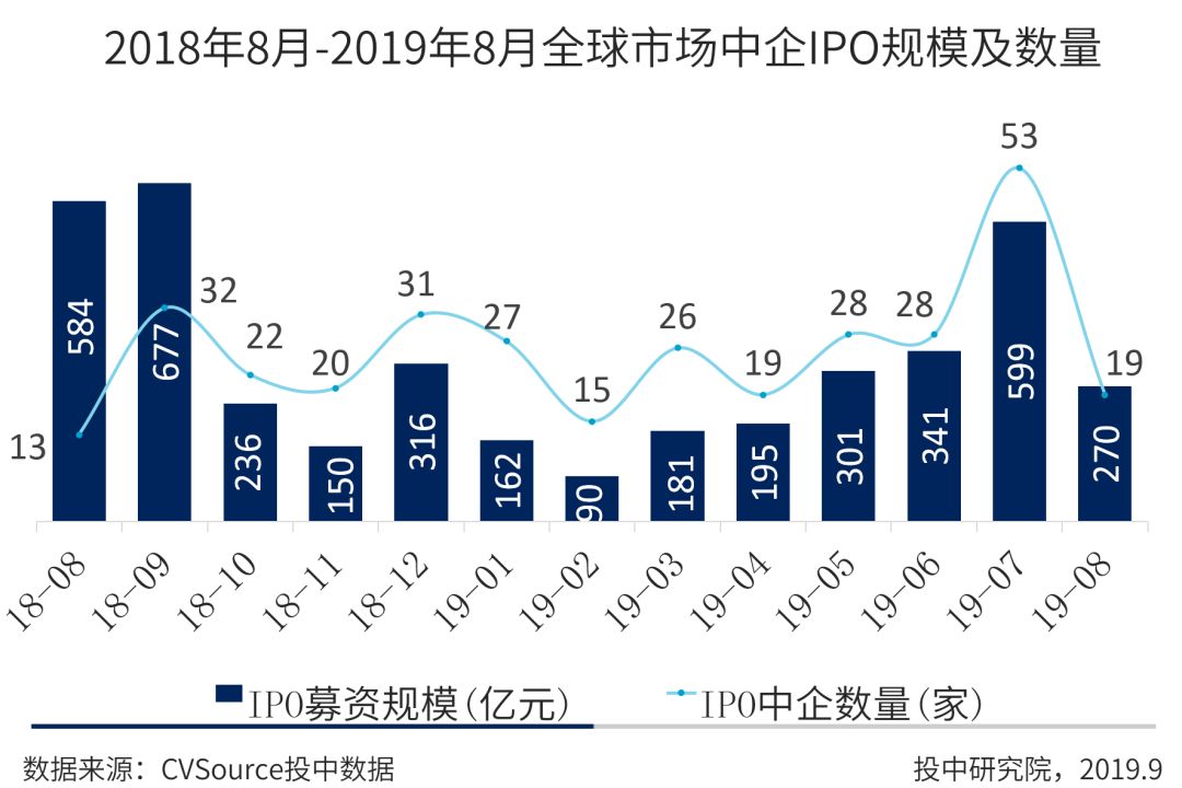 图表 22018年8月-2019年8月全球市场中企IPO规模及数量