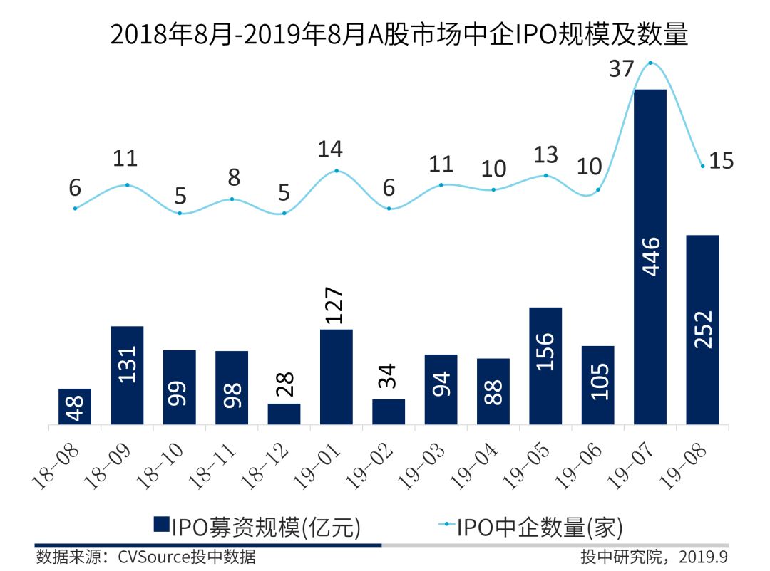 图表 32018年8月-2019年8月A股市场中企IPO规模及数量