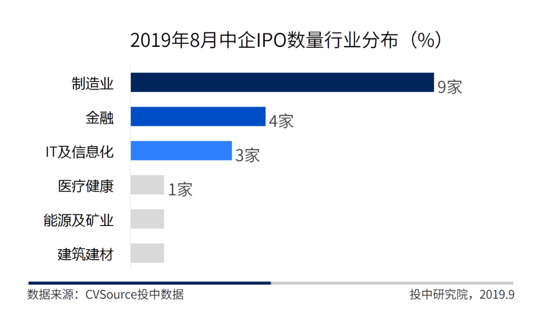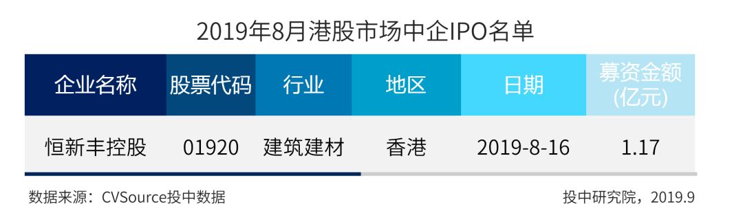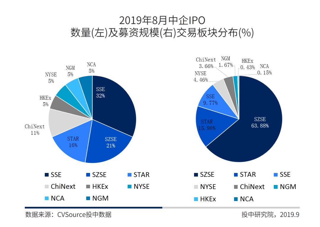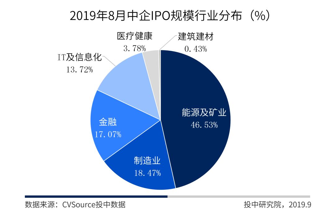 2019年8月, 能源及矿业股IPO 规模稳居榜首, 广东地区 成为本月IPO最吸金地区, 深交所中小板 IPO现百亿巨无霸项目。