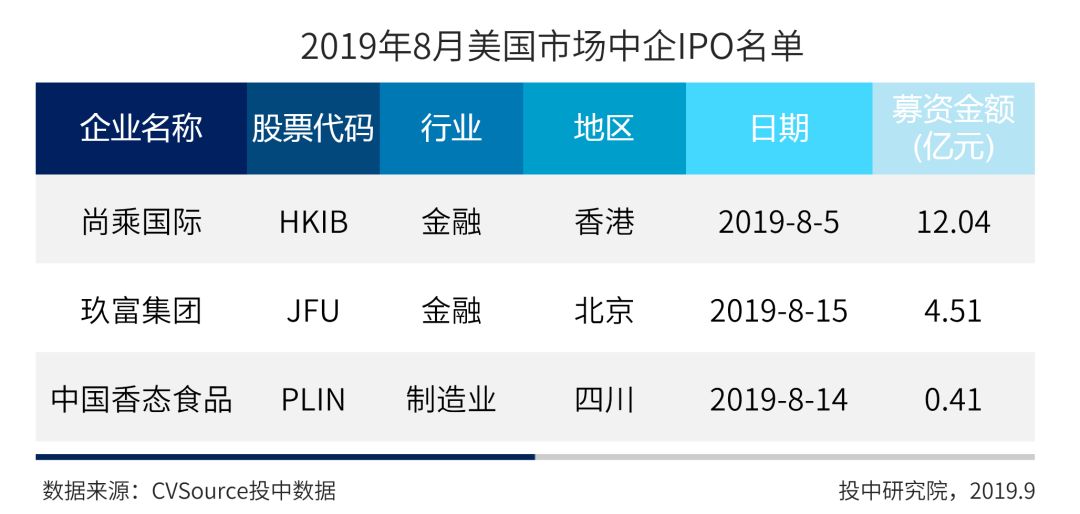 2019年8月,共计3家中国企业在美国资本市场IPO,数量上与上月持平,募资金额共计17亿元,环比减少65.31% 。本月上市的3家中国企业有2家来自于金融行业、1家来自于 制造业 ,自18年8月份以来,美股市场IPO数量及募资规模一直呈大幅波动的态势。(见图表5、表格2)