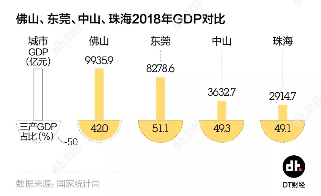 城市间最直接的较量就是经济实力。如果只看传统经济实力指标GDP的高低,佛山这些年一直稳坐广东省第三把交椅,东莞紧随其后,中山和珠海基本维持在第6-10名。具体数字比排名更能展现这几座城市的经济体量差距。2018年,佛山GDP达到了9935.88亿元,这个数字是东莞的1.2倍、中山的2.7倍、珠海的3.4倍。
