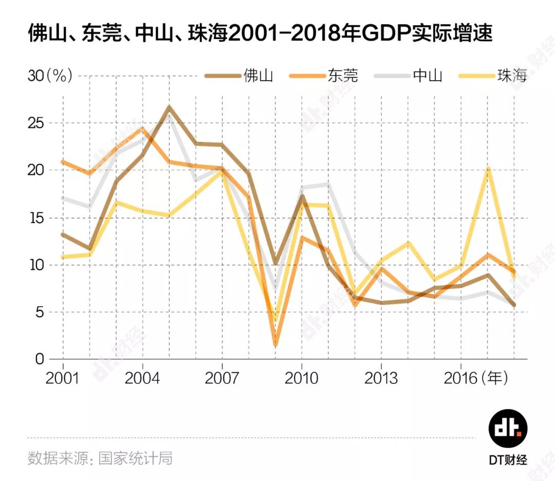 2005年之前,东莞和中山经济增速远超佛山。但在2008年全球金融危机中,过于依赖外贸出口的东莞受到冲击开始减速,佛山靠着满足内需的制造业顺势超车。接下来几年东莞壮士断腕,集中力量产业转型,2013年其GDP增速重新超过佛山,2016年超过广州,2018年更是超过深圳位列广东省第一。