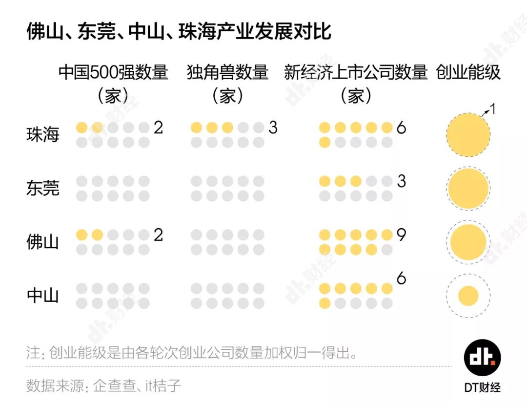 佛山有最多的新经济上市公司,创业公司数量比珠海和东莞更少一些,创新氛围一定程度上相对稀薄。