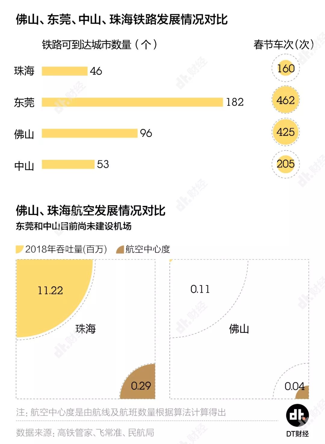 东莞则在铁路网络中有最强的辐射力 ,通过铁路连通了182座城市,远超过佛山的96座、中山的53座和珠海的46座。在春节期间,东莞和佛山都有超过400趟车次经过,代表相当可观的人口流动。