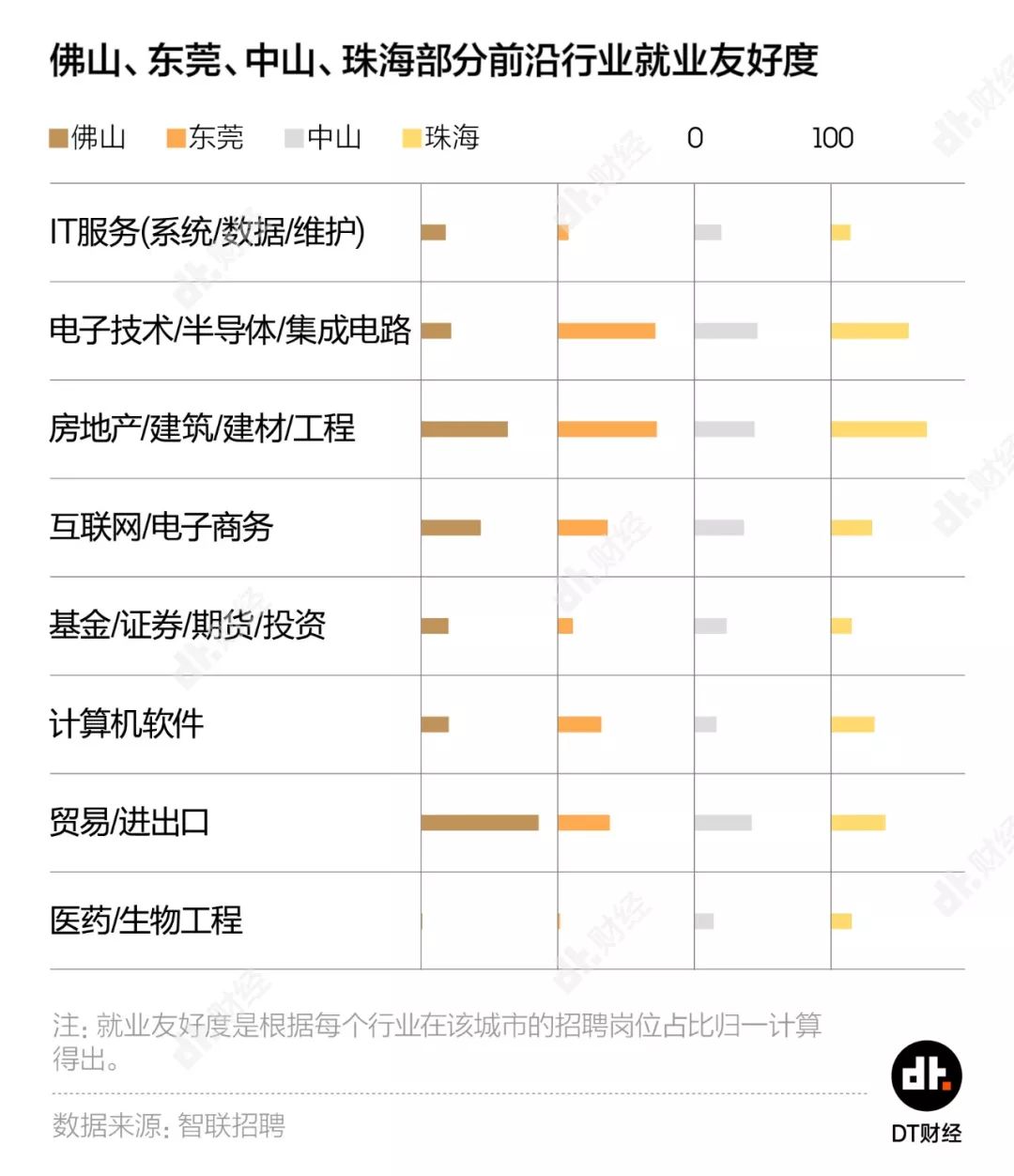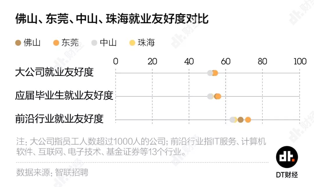 在由大公司就业、应届生毕业就业和前沿行业就业组成的就业友好度评价中,东莞是广东省除广深之外得分最高的城市,也就是说,能提供最丰富的就业机会。