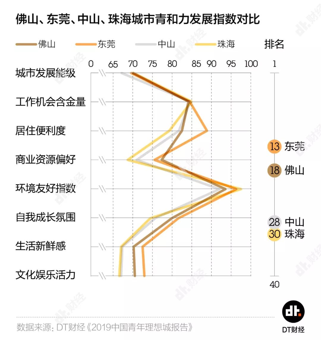 在《2019中国青年理想城》报告中,大湾区还有四座城市青和力排名靠前,代表对年轻人有更强的吸引力,它们分别是 东莞、佛山、中山和珠海 ,正好位于珠江口东西两岸。