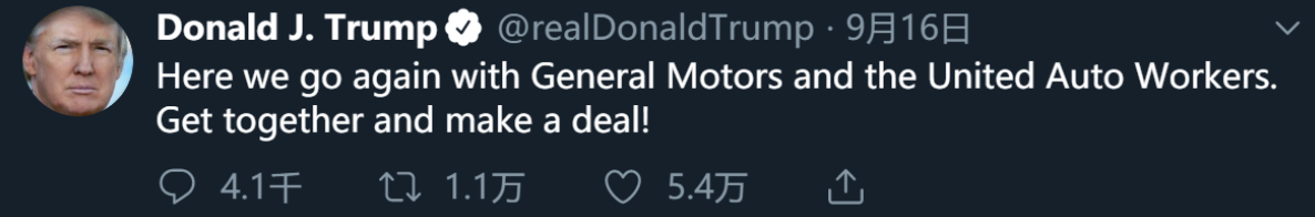 甚至本次大罢工也引起了美国总统特朗普的注意。罢工爆发当天,特朗普发表推特称让通用和UAW好好坐下来谈判。
