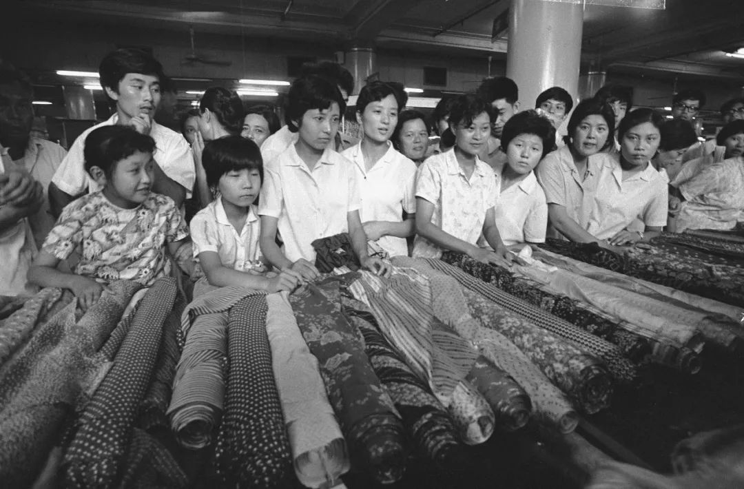 1979年8月,上海,成群结队的顾客在上海一家百货商店中挑选布料来制作色彩鲜艳的衣服。图片来源:视觉中国