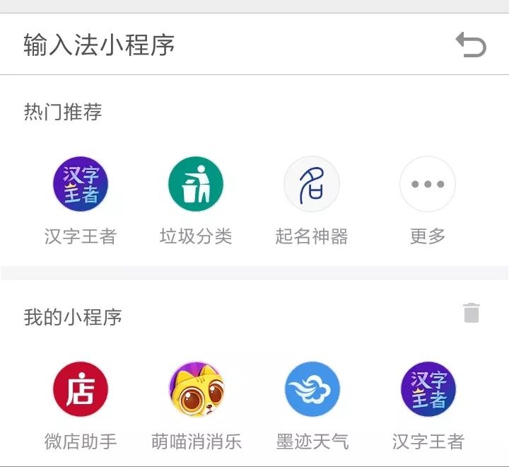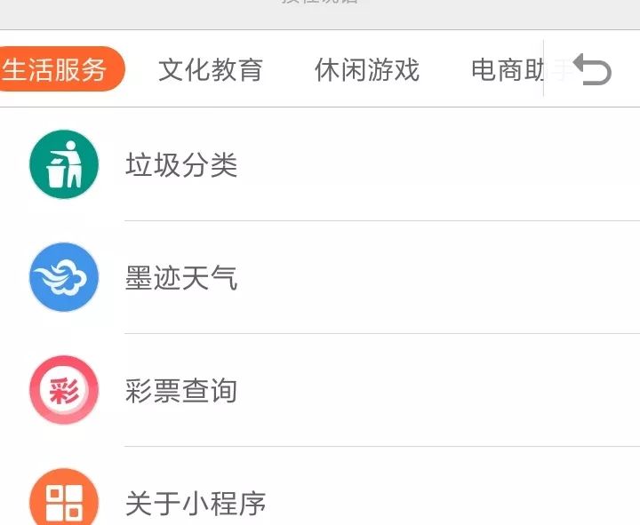 从上图可以看到,输入法小程序目前只有生活服务、文化教育、休闲游戏、电商助手等4类,而且数量上并不多。比如,生活服务只有垃圾分类、墨迹天气彩票查询等常用的。