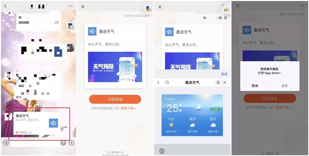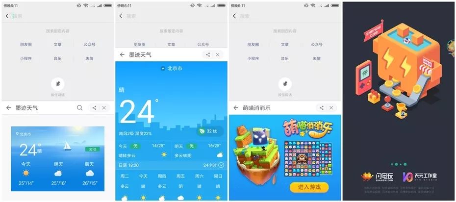 比如,朋友间聊天的时候,聊到“今天天气怎么样”的话题,不用离开对话框去找「墨迹天气」小程序,而是在搜索框里直接打开「墨迹天气」,将天气通过小程序的方式分享给对方。