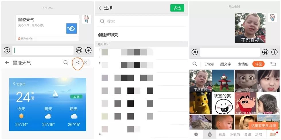 以墨迹天气为例,在微信聊天时,如果有查天气的需求,就可以直接进入输入法小程序查看,而不用切换到其他天气App。然后点击分享即可,然而它并不能像输入法内的表情包一样,做到“一触即发”,仍要进入“选择好友”的界面。