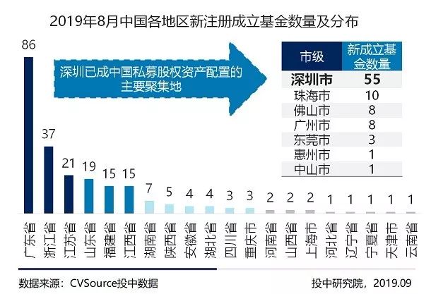 2019年8月新注册成立的230支新基金中,广东省新成立基金 86支 ,其中 深圳市 新成立基金 55支 ,继续 强势领跑 全国。今年年初,深圳市出台《促进创投行业发展的若干措施》鼓励市政府引导基金、国有企业、专业化创投机构、天使投资、金融机构等主体进入创投行业,通过 丰富创投主体 实现创投资金集聚,创新创投募集资金方式 拓宽资金来源渠道 ,解决创投行业发展中存在的募资难问题。随市场发展及政策推动,目前 深圳市 已逐步成为中国私募股权资产配置的 主要聚集地 。