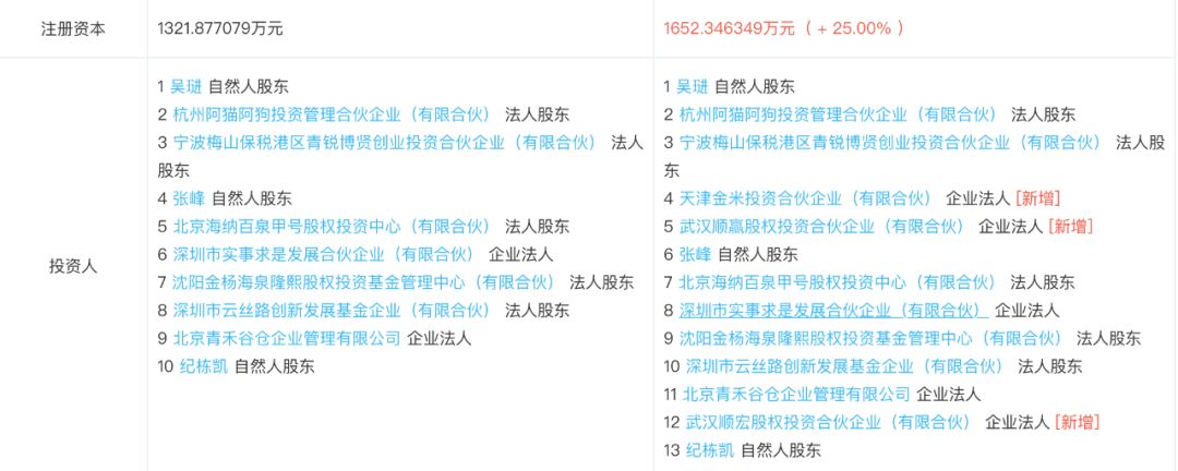 天眼查数据显示,9月17日,北京猫猫狗狗科技有限公司完成了新一轮工商变更,注册资本增加25%至1652.35万元,与此同时也新增了三位投资人。