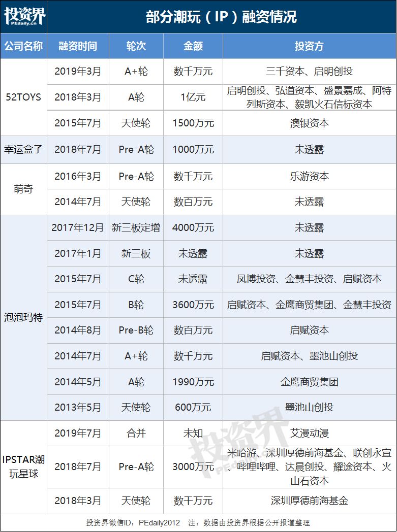 另一方面,从潮玩IP大的层面来看,三千资本投了 IP 衍生品平台 52TOYS、乐游资本投资了做 IP 衍生品授权的萌奇……尽管头部机构入局并不多,但玩具类IP始终是一个长青话题。