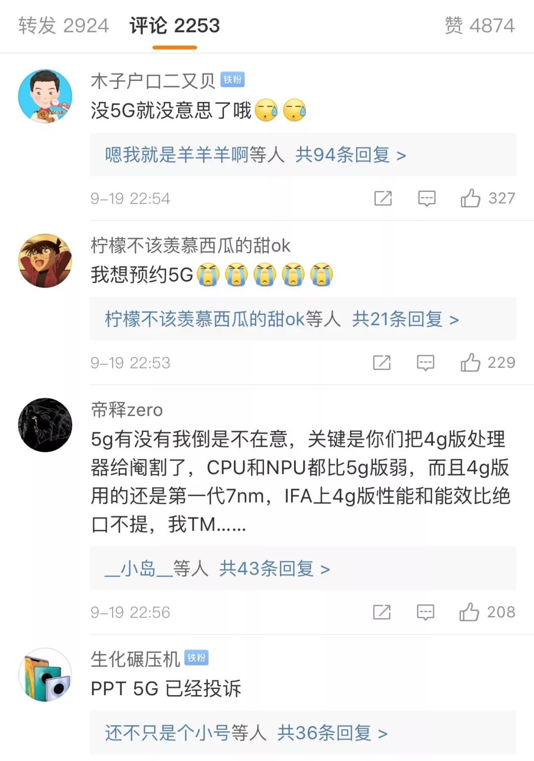 Mate20 X(5G)已经在售中,但是此次新发布的Mate30系列目前将接受预定的只有4G版本的Mate30系列,不少网友在余承东微博下留言表示更期待5G版本,甚至有网友吐槽称是“PPT 5G”。