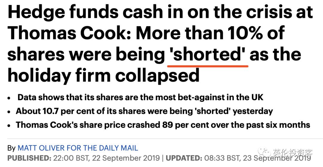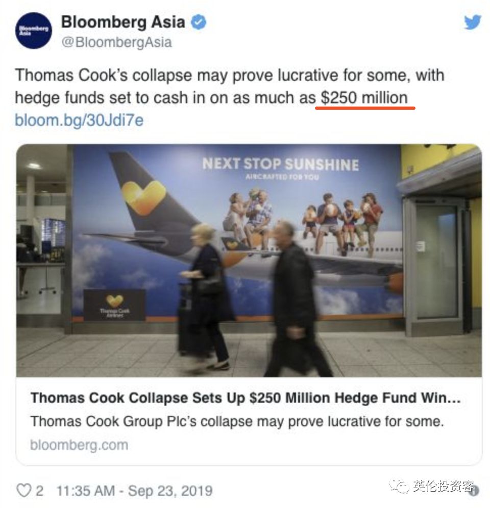 也就是说,当Thomas Cook因为2亿英镑而黯然破产时,对冲基金们靠着做空Thomas Cook,大赚了一笔。
