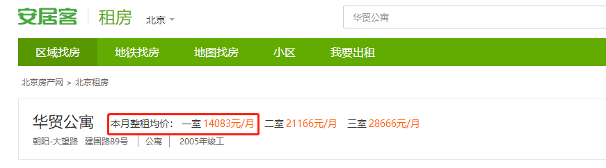 但是,对于大部分普通的“空巢青年”,这种单身公寓好像有些太奢侈了。根据安居客的数据显示,北京华贸公寓,一室的单身公寓一个月的租金就要14000。当然这还不是最贵的,梵悦108的一室公寓,每个月租金33000。