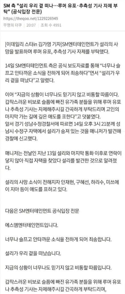 据韩国警方透露,今日(14日)下午3时20分许(韩国时间),警方接到了雪莉经纪人“雪莉在京畿道城南市寿井区家中死亡”的报案后立即出动,并确认了其死亡的消息。