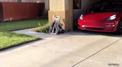 最后,长按手机上的虚拟按钮车辆才会移动,一旦松开手指,特斯拉就会停下来。