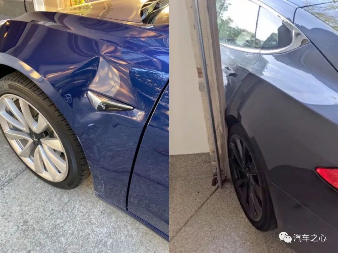 其中一辆 Model S 是在出车库门时擦到的,而另一位工程师的车则是直接蹭到了隔离柱。