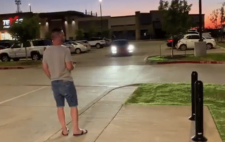 这一停,又堵住了正往停车场进的黑色 SUV。看到停止的 Model 3,对面的车主给它挪了挪位置,但它还是僵在那里不知所措。随后,Model 3 往后退了退才开始往前走。