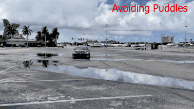 第三辆车则和大雨后停车场上的积水玩起了躲猫猫。