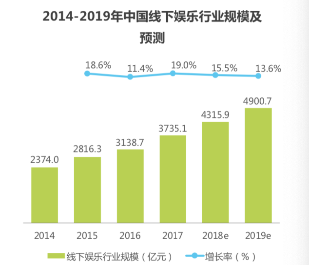 《不眠之夜》在上海的持续热映反映了当下中国线下娱乐行业广阔的市场前景。 根据艾瑞对中国线下娱乐行业的市场规模预算,中国线下娱乐各行业类别均保持稳步增长的态势,2019 年总体市场规模有望达到 4900 亿元。