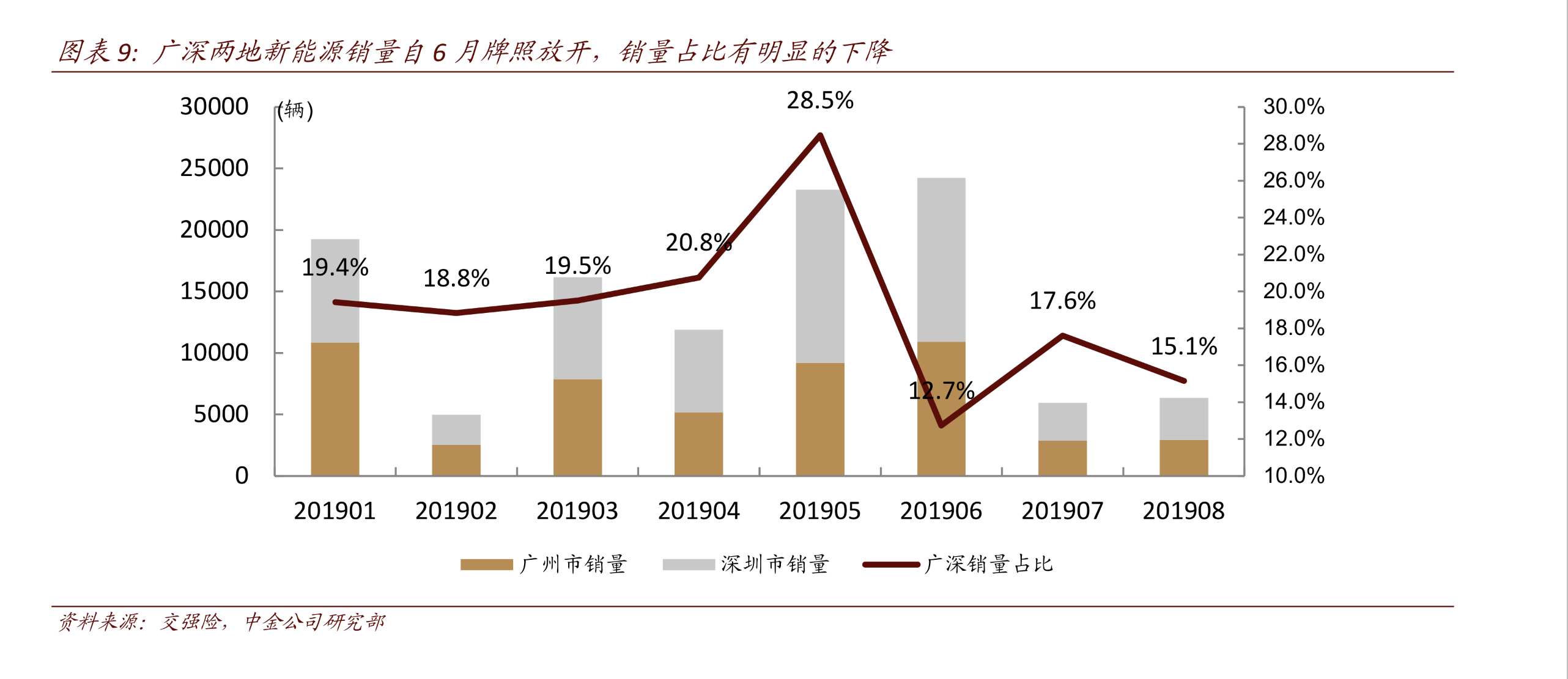 此外,新能源销量较为集中的广州和深圳燃油车牌照放开,对全国新能源汽车销量产生了明显影响。今年6月,广州市和深圳市交通运输局政策规定,广深两地自2019年6月至2020年12月将分别新增8万、10万张牌照。