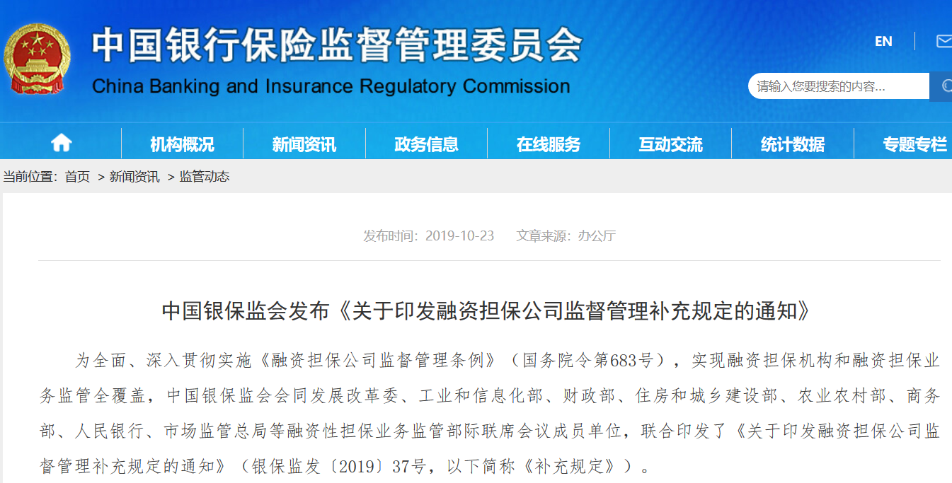 10月23日,银保监会、发改委、工信部、财政部、住建部、央行、农业农村部、商务部、市场监管总局等九部门联合印发《关于印发融资担保公司监督管理补充规定的通知》(银保监发〔2019〕37号,以下简称《补充规定》)。