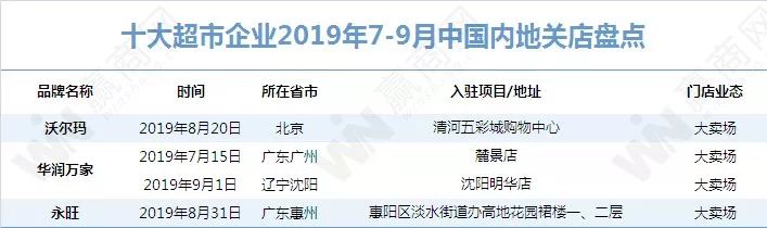 三季度, 华润万家关闭了2家门店 ,其中沈阳明华店将升级为万家MART,将于年底重新亮相;麓景店则是“因合约到期,业主另有用途”而关闭。