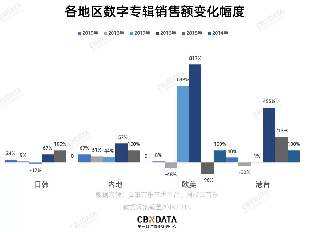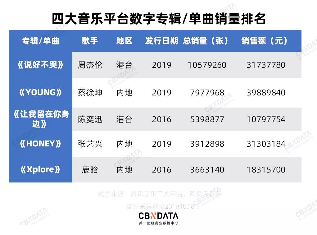 日韩艺人风光不再,2019年前10个月日韩歌手数字专辑销量仅为3212256张,较2018年下降了16%;港台地区歌手的专辑销量较去年增长156%,仅《说好不哭》就贡献了总销量的62%,侧面印证了港台乐坛青黄不接的尴尬局面。