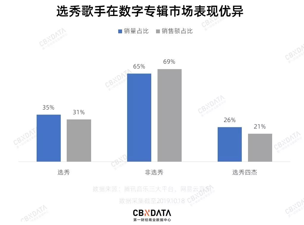专辑破百万越来越容易的同时,选手也越来越年轻了。1998年出生的蔡徐坤,凭借一首《YOUNG》就坐上了总榜第二的位子,仅次于周杰伦,超越陈奕迅、鹿晗、李宇春等前辈。据统计,《偶像练习生》《创造营2019》《创造101》和《青春有你》四档选秀节目出身的歌手,专辑总销量达到了4600万张,占到了总销量的26%。