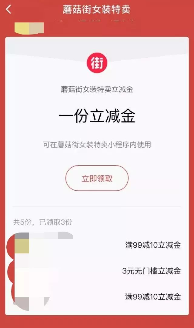 在此玩法上,蘑菇街是比较好的案例。用户在蘑菇街小程序内购物后,可在支付完成页获得“立减金”,或者通过模板消息领取。然后,用户可将“立减金”分享给自己的好友和微信群后,而好友在领取一份“立减金”后,也可以通过快速入口完成新的交易。