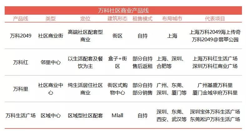 随着万科向“城乡建设与生活服务商”战略转型,其逐步向城市最小的社区单元下沉,形成了万科2049、万科里、万科红、万科生活广场四条产品线,类型也由住宅底商扩大至社区商业街、精品社区商业、邻里中心等