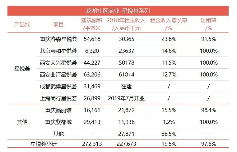 2018财年,龙湖星悦荟系列租金收入同比增长19.5%达2.28亿元,占其投资物业租金总收入的6.3%,出租率达97.6%。