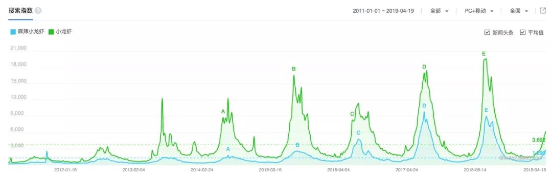 图片来源:百度指数——小龙虾的指数暴增出现在13年中,并达到周期性稳定