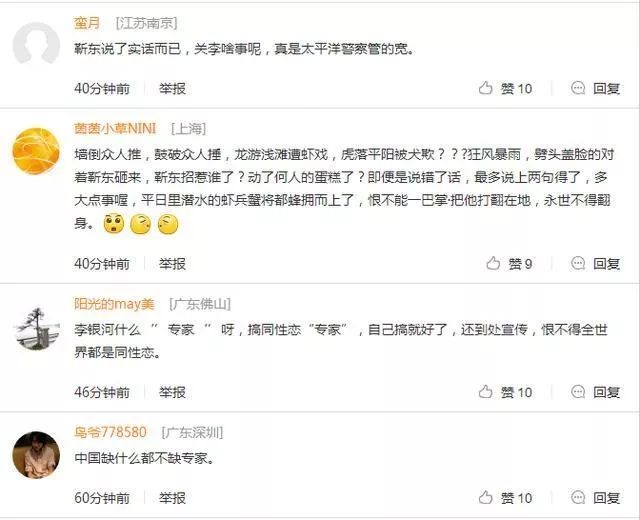 2017年9月的时候,李银河曾经和靳东打了一场嘴仗。起因是靳东在微博上表示“(自己)是一纯爷们,纯爷们就爱跟纯爷们合作, 刚烈、简单、明了,一切不男不女、非爷们的人事,都无意接触”,围观的吃瓜群众们相信这是对“小鲜肉”群体的一种表态,而李银河则认为“中性化焦虑”,“不尊重少数群体,没有教养”——于是正反双方开始隔空打起了嘴仗。