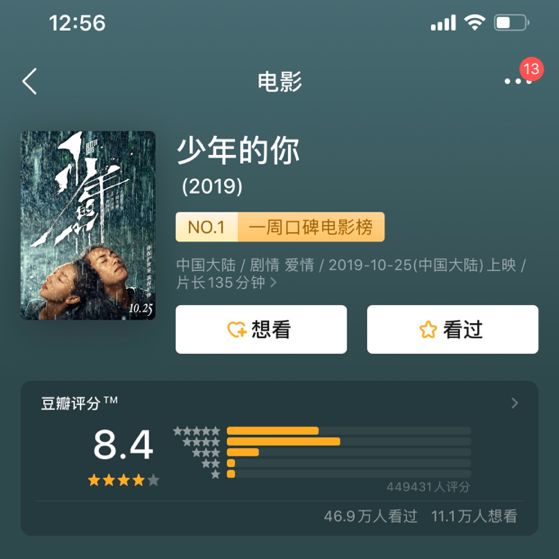 从柏林退围、六月撤档到低调的几乎是“零宣传”的空降定档,《少年的你》可谓命途多舛。与一路下沉的坏运气相对的是一路飙升的票房和持高不下的口碑——截止写稿,《少年的你》已经斩获超过12亿的票房,豆瓣评分也稳居8.4左右。