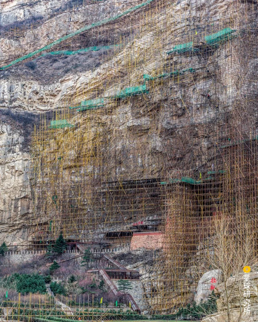 (2016年悬空寺危岩体加固工程,脚手架从山脚直抵山顶,摄影师@雾雨川)