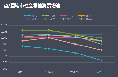 一线“失宠”,背后部分原因是,其所在的东部地区,人口结构、商业基建、创新能力等都已相对稳,零售商业增长空间见顶。以社会零售消费增速来看,2015-2018年全国整体增速放缓。其中,北上广深所在的东部地区增速,则普遍低于重庆、湖北、湖南等中西部地区。而过去商家必争的北京,近年来的社会零售消费增速一直低于转型中的黑龙江。2015-2018年,二者增速分别为7%、7%、5%、3%和9%、10%、8%、6%。