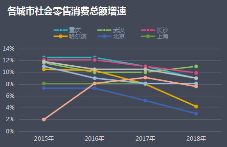 当然,看到趋势变化的不只有阿里一家,在这个双11京东、苏宁们也都做出了反应。京东双11最大的线下战场——首个京东电器超级体验店,放在了重庆;而苏宁易购双11嗨爆夜,选在长沙。过去四年中,长沙、重庆的社会零售消费总额增速整体高于一线城市。重庆2015-2017年社会零售消费增速一直位列第一,分别为13%、13%、11%;直到2018年滑落至9%,被武汉(11%)和长沙(10%)赶超。