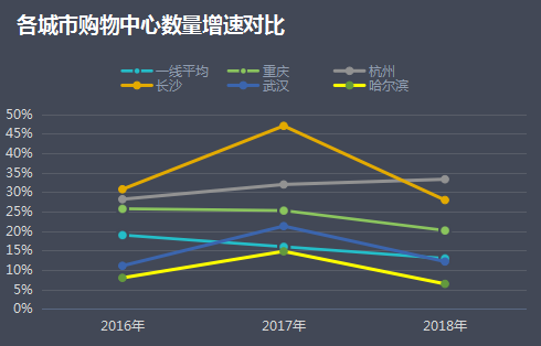 而从最重要的线下场景——购物中心新开业数量来说,长沙、重庆增速亦整体高于一线城市。赢商大数据显示,2016年到2018年,北上广深平均增速逐渐下降,分别为19%、16%、13%。